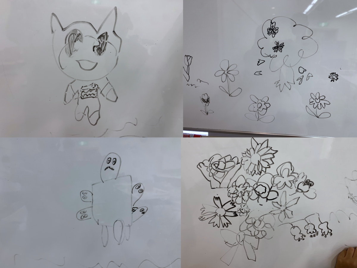 こちらもおなじみちびっこニンジャによるホワイトボードお絵かき。あつもりのねこ、お花畑、たまご会議?、花束。花束なんかよくみると花びらもこまかく丁寧に描いてるよね〜。